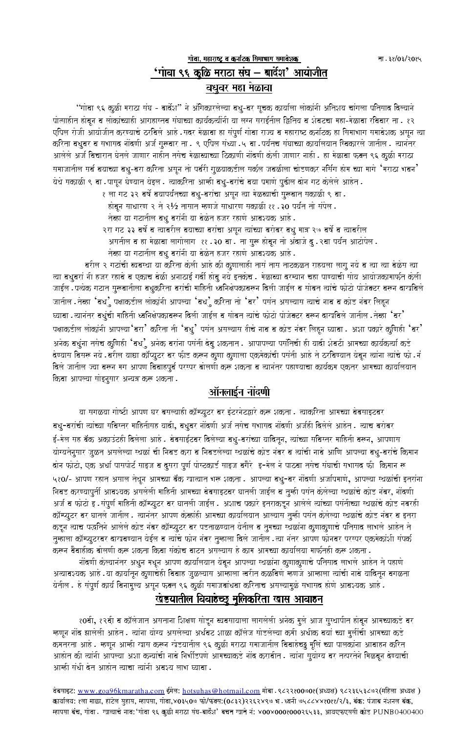 In respect of the earlier Vadhu-var melawa dated 14th Dec. 2014, it is noticed that all the vadhu-var have not submitted the list of their suitable matches so as to decide by ourselves the reciprocal preferances offered by both parties and accordingly inform them, Only few have done so. It is therefore, all the vadhu-var, especially vadhus or their parrents are requested to come to the office of 96 Kuli Maratha Sangh at Hotel Suhas, Mapusa any time, to view the biodata and photographs of their suitable matches and enlist them so that, we can decide the reciprocal preferences of both parties and inform them of their mobile phone numbers so that they can have a primary talks amoung themselves and after both sides mutual satisfaction can come to us for meeting in persons or for further advice. Also those who have not submitted their photographs are requested to do so as soon as possible so that the other parties are free to choose their match and decide.